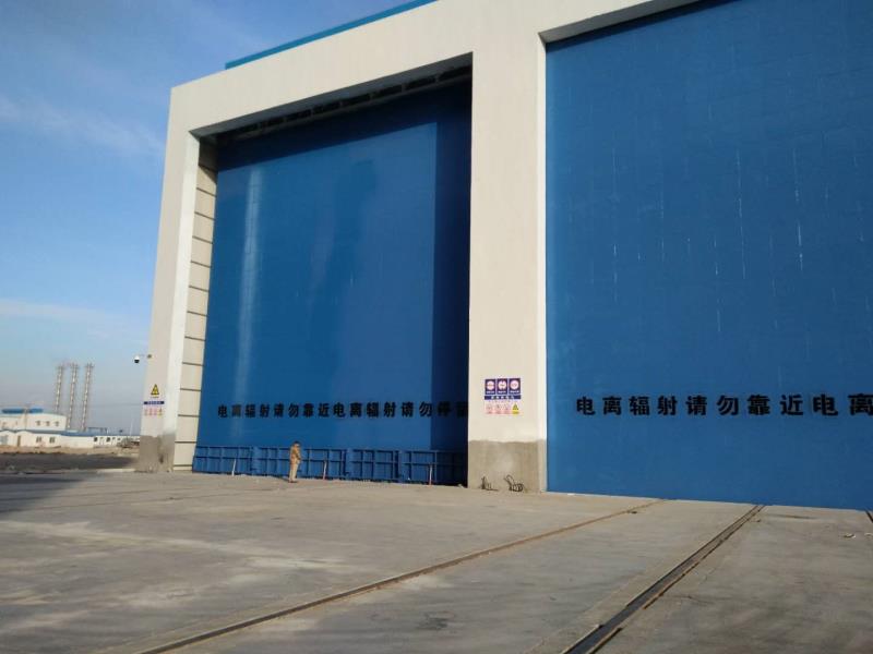 船厂屏蔽门是针对船体无损探伤检测所必须配备的工业辐射防护重要设备,其满足船舶工件、分段正常进出探伤室条件,及在探伤检测时可保证高能射线不会对周围环境和人员造成危害。该项目中,X射线探伤室屏蔽门尺寸为19.2m×19.7m×0.98m,铅板总厚度55mm,γ射线探伤室屏蔽门尺寸为19.2m×19.7m×1m,铅板总厚度72mm,均为亚洲最大尺寸的铅板防护形式的屏蔽门,采用整扇门板形式,推拉式启闭,互为门库。管子探伤室屏蔽门2扇/樘,每扇门尺寸3.7m×6.7m×0.58m,铅板厚度67mm,采用对开形式。操作室屏蔽门3樘,每扇门尺寸2.2m×2.8m×0.25m,铅板厚度35mm,采用推拉式启闭。